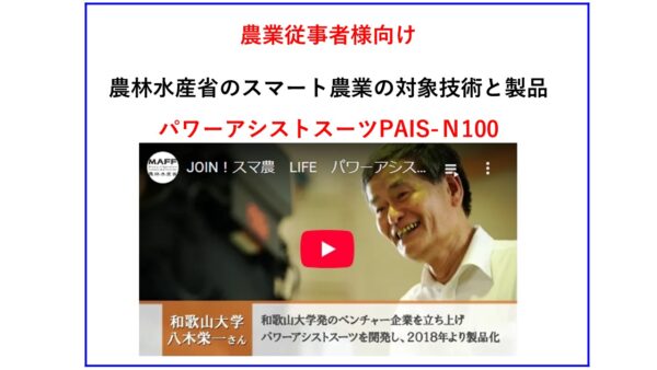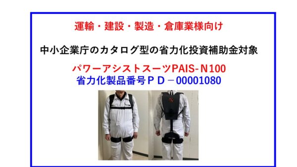 パワーアシストスーツ:PAIS-N100は、2.9kgでランドセル型軽量コンパクトな新型パワーアシストスーツです。電動モータにて腰のアシストができるパワーアシストスーツです。